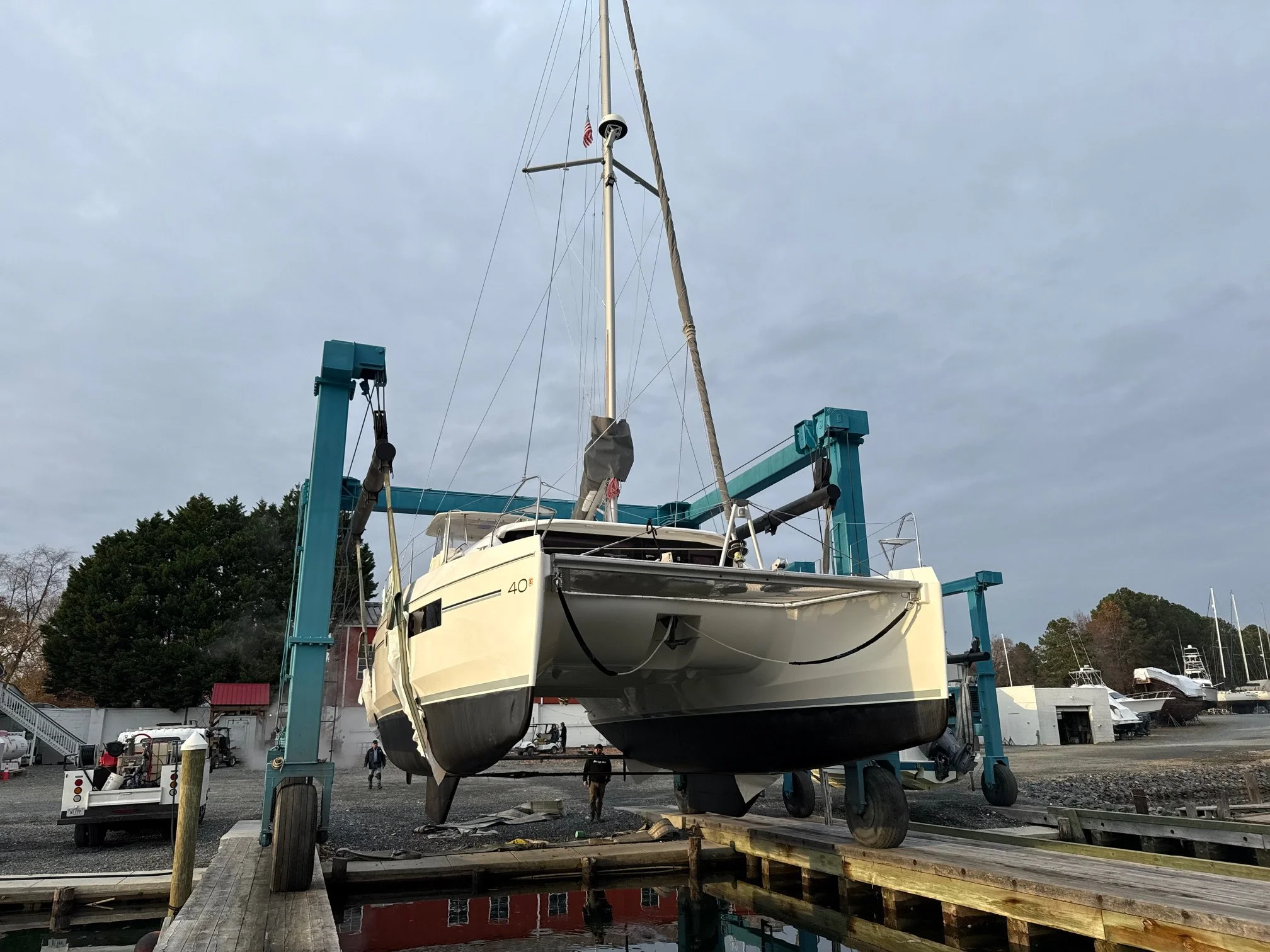 We offer secure, level land storage perfect for catamarans. Whether you need a quick "wash and hang" for a survey or multi-month winter storage, we provide ample spacing between vessels to ensure your multihull is accessible and safe.
