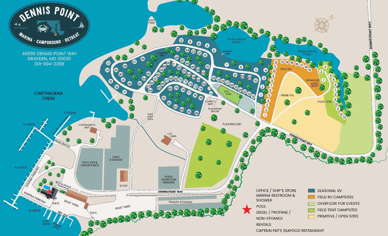How do I book a stay or a slip? You can book transient or seasonal slips via dennispointmd.com/marina. You can book transient or seasonal campsites via dennispointmd.com/campground. For inquiries, please call us at 301-994-2288 or email bookings@dennispointmd.com.